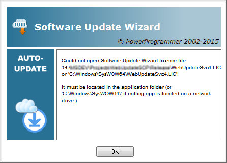 Note also that you must always deploy your registered licence file, WebUpdateSvc4.lic, with your application. Please ensure it is installed into the same folder as the application file which will be calling the Software Update Wizard. If a licence file is not found in the same folder as the application file which called the Software Update Wizard then the call will fail with the following message box: