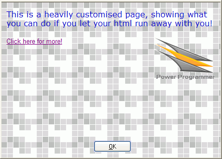 This script is the same as Example 1, but in addition a dialog message box will appear containing the html text in the Message= keyword line.
